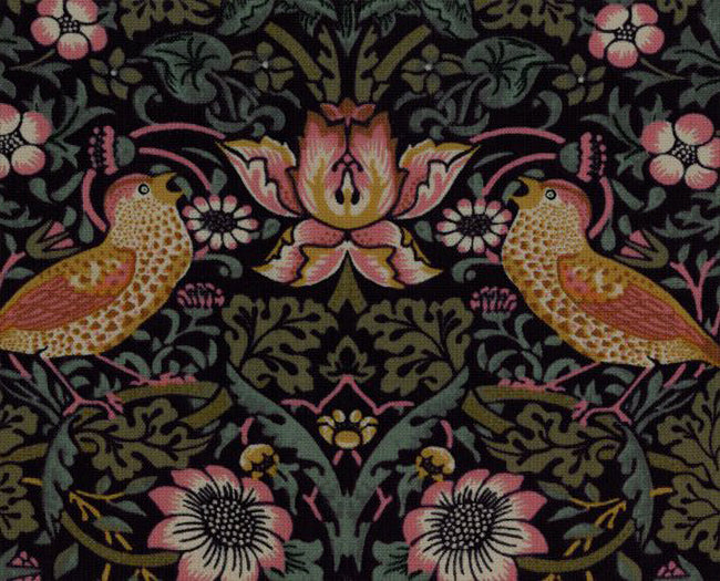 ウィリアム・モリスの代表的なデザイン「イチゴ泥棒」です。向かい合う鳥とイチゴを咥えた鳥、そして花々が美しく配置されています。元々は壁紙などのインテリアのために作成された連続模様ですが、模様を生かした小物づくりや、色合いを取り入れたパッチワークキルトに最適です。お好みのスタイルで芸術を身近に感じられる、高品質な生地です。