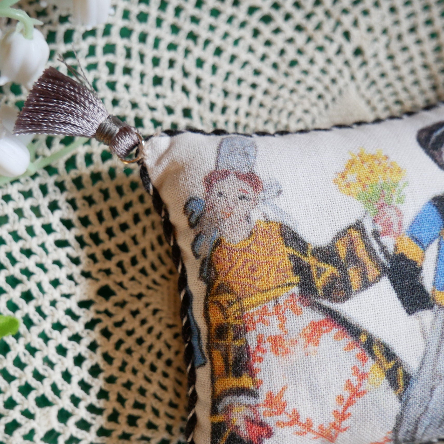 材料費の内容:紫モーブの図案集#107(1冊)、リネン刺しゅう布32ct、中綿(羊毛)、裏布(シーチング)、黒の飾り紐、刺しゅう針(1本)、刺しゅう糸(黒1巻)、ミニタッセル(4個)