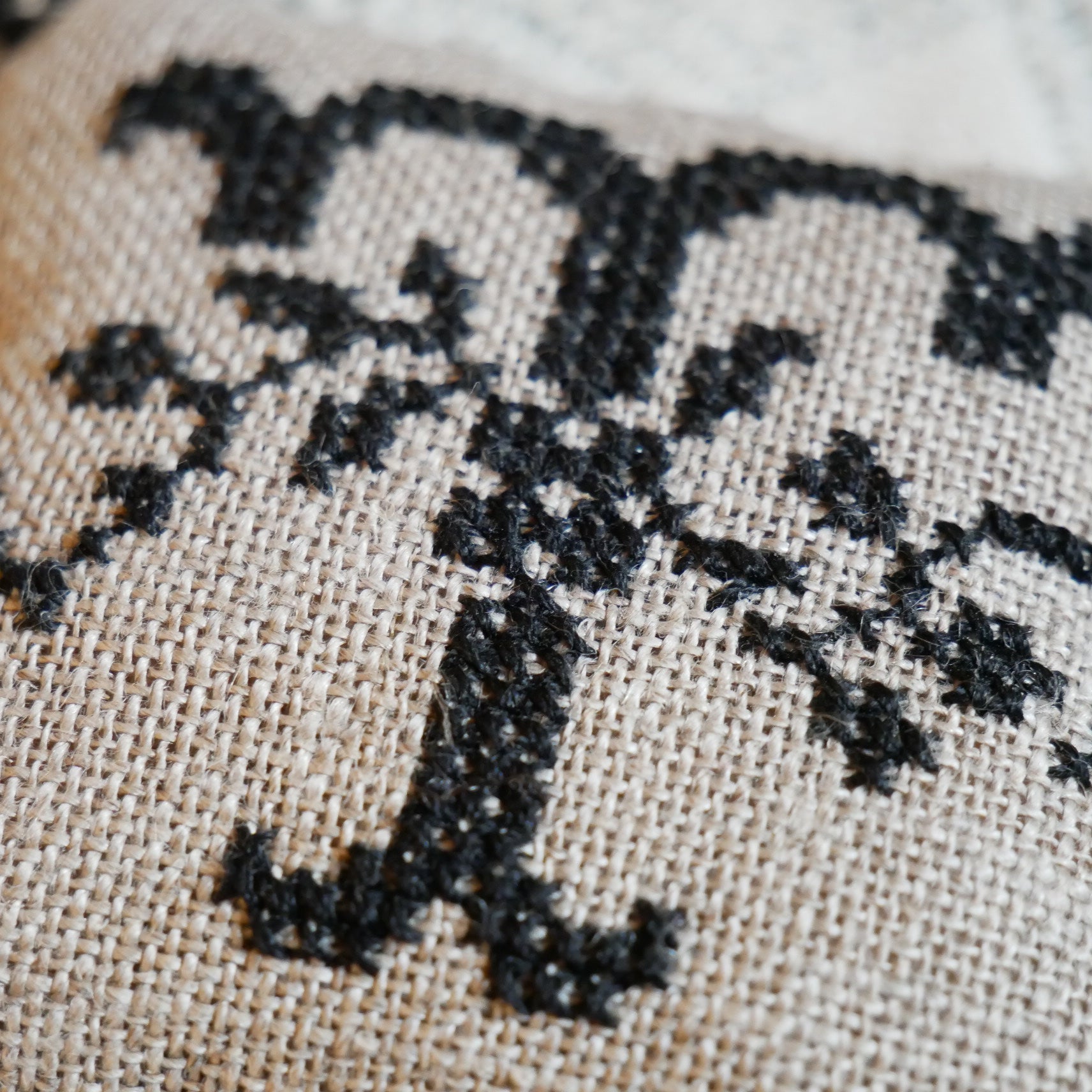 アンティーク復刻図案で作る、黒のイニシャル・ピンクッション。流れるような花飾りが印象的なデザイン。図案の読み方から刺し方の基礎までお教えします。拡大ルーペの貸し出しもございますので、ぜひご参加ください。