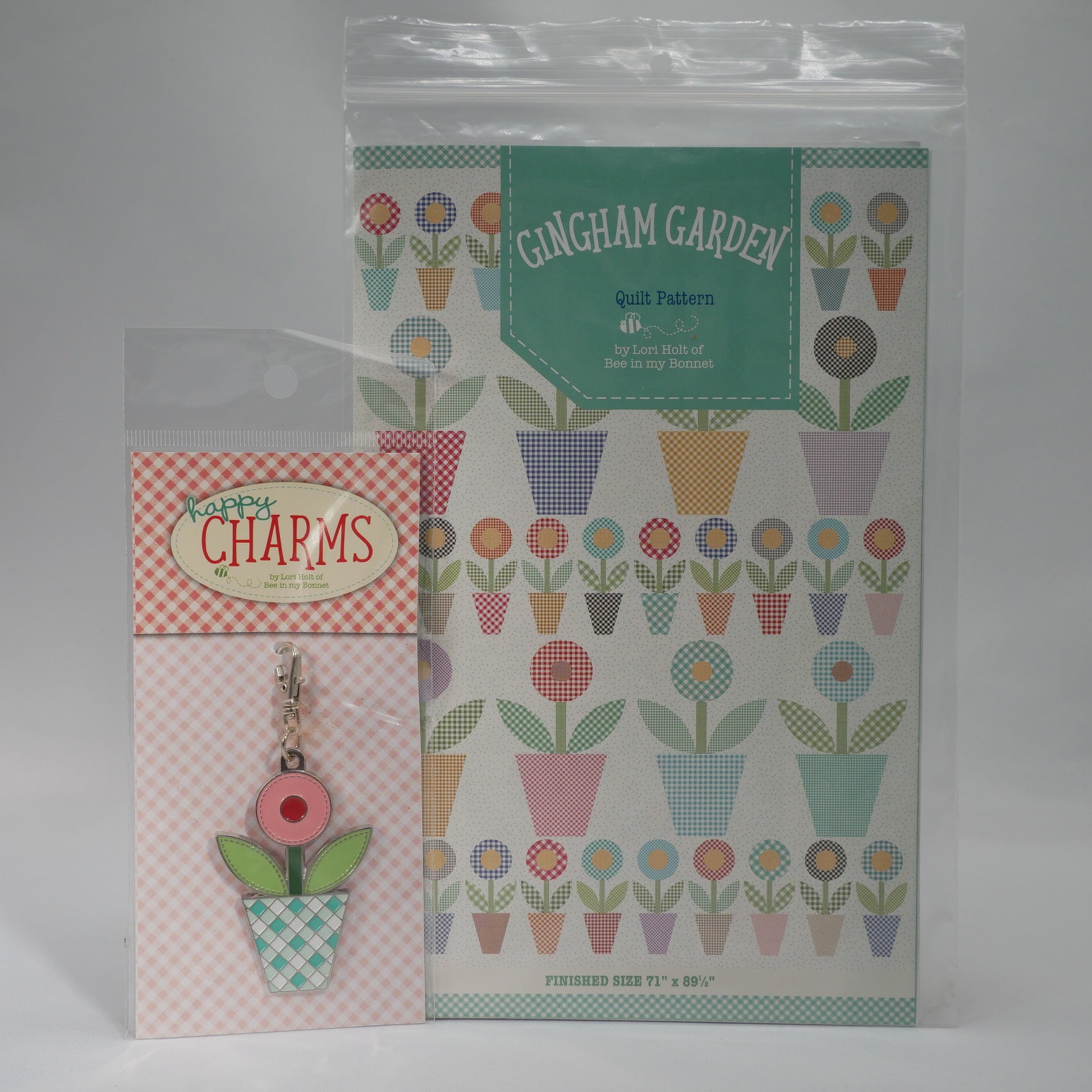 ギンガムチェックのお花が咲き並ぶアップリケとキルトパターン。専用テンプレート、ジッパーポーチ、ジッパーチャームもお付けして、通常価格の15%割引セット。テンプレートは他のキルトパターンでもご利用頂ける汎用性の高い形です。