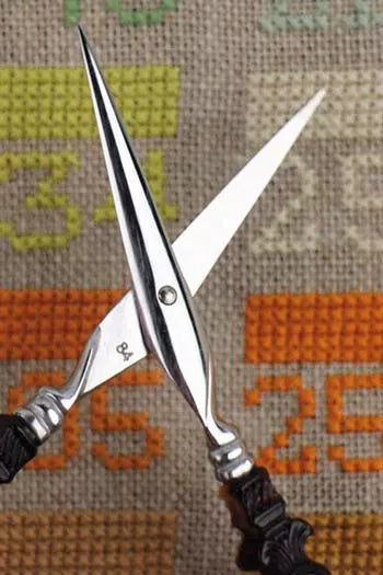 本品は多くの作業工程を経て作られ、各工程ごとにベテラン職人が携わり製作された高級刺しゅう用ハサミです。写真ではハサミの刃に「84」という数字が刻印されていますが、これは作業工程のはじめに左右の刃に数字を付与することにより、最終的に特定の刃を対にするためのこだわりによって印されたものです。かつてこの原型となるハサミが生産された19世紀には、刃物職人と彫刻職人がそれぞれの工程を担当していました。現在でもこの流れをそのままに、刃物職人とサジューが所有する彫刻部門の職人それぞれが、この復刻版の刺しゅう用ハサミの製作にあたり、現代においてもなおアンティークの美しさを留めたハサミが生まれているのです。