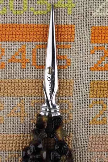 アンティークの刺しゅう用ハサミの復刻版。サジュー・プライベートコレクションより、シャルル10世の時代を彷彿とさせる、ベッコウのコントラストが美しいハサミです。ベッコウはイミテーションです。持ち手は美しいフラワーの花綱模様。シャルル10世は1824 年に即位したブルボン朝最後の国王でルイ18世の弟。フランス革命後の王位継承者として即位し1830年7月革命で退位しました。その時代によく見られたデザインを復刻しました。