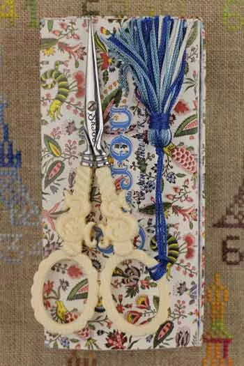 アンティークの刺しゅう用ハサミの復刻版。サジュー・プライベートコレクションより象牙調のオフホワイトが美しいハサミです。持ち手をサジューの頭文字「S」にかたどり花綱模様にしています。かつては貴重な象牙を様々な手芸用品に使用していましたが、この復刻版ではイミテーション素材を使用し、軽量に仕上げました。