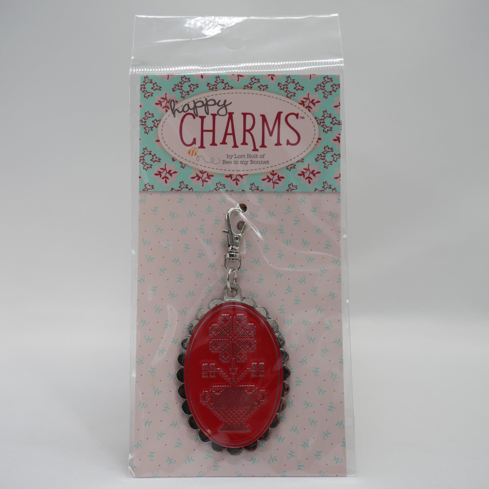 アメリカの人気キルターLori Holtがデザインしたジッパー・チャームをプレゼントいたします。画像の商品は、クロス・ステッチのフォルクロアなお花と花瓶。刺しゅうにまつわるデザインをお選びいたしますので、色柄はお任せください。